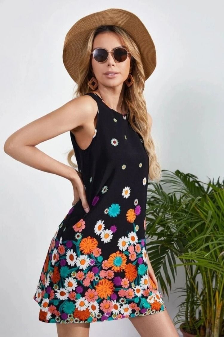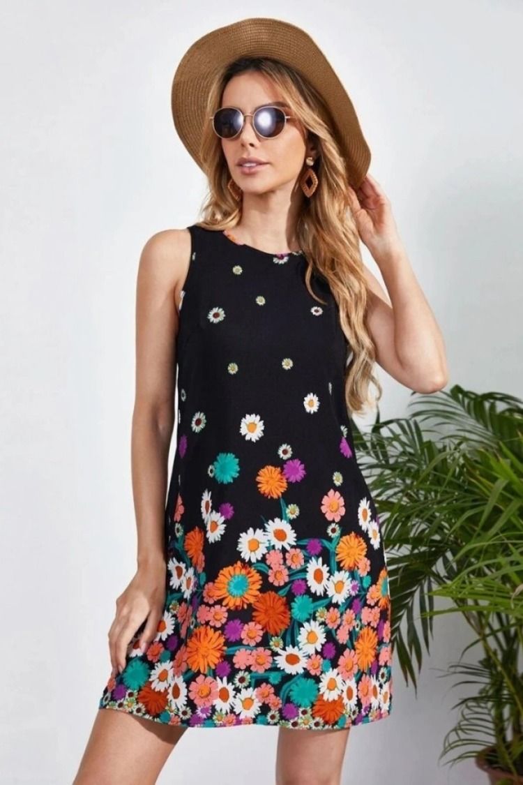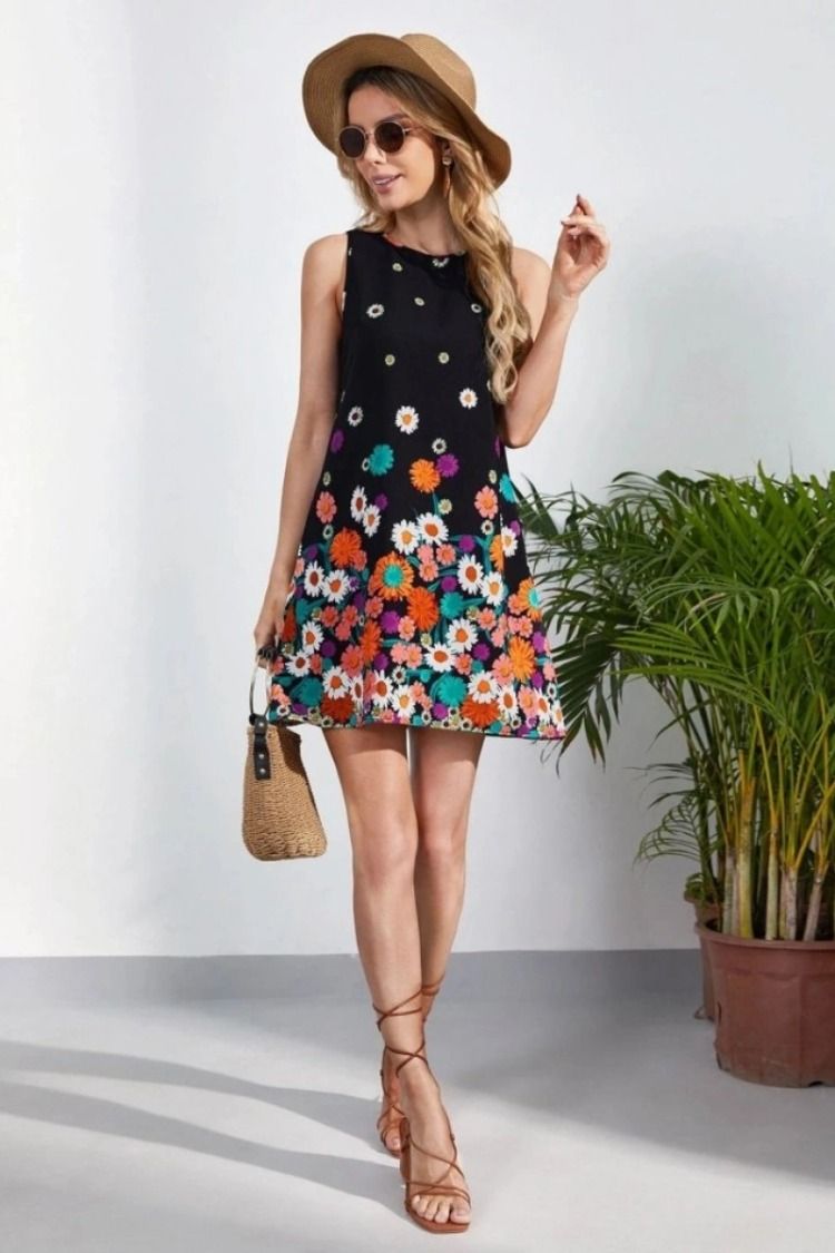 Kadın Sıfır Kollu Bisiklet Yaka Çiçek Desenli Süprem Mini Elbise
