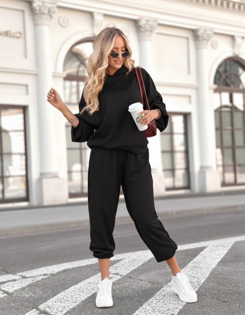 Kadın Uzun Kollu Kapşonlu Viskon Iki Iplik Bluz Ve Pantolon Ikili Takım