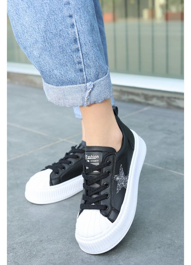 Piata Siyah Cilt Beyaz Tabanlı Bağcıklı Spor Ayakkabı