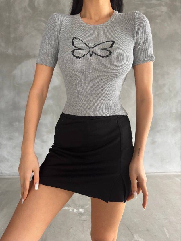 Kadın Kelebek Desenli Bisiklet Yaka Fit Bluz