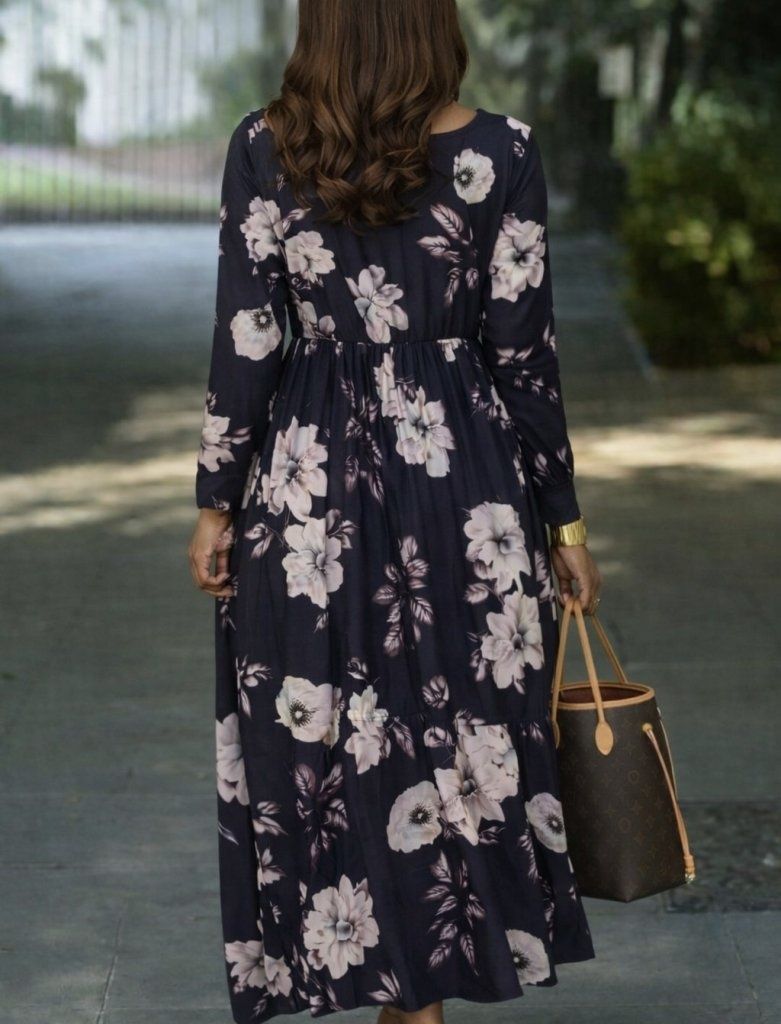 Kadın Uzun Kollu V Yakalı çiçek Desenli Maxi Süprem Elbise