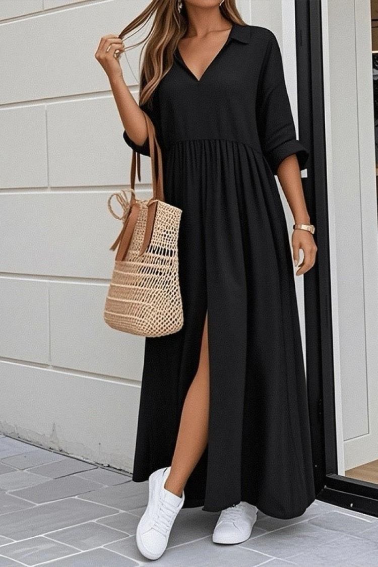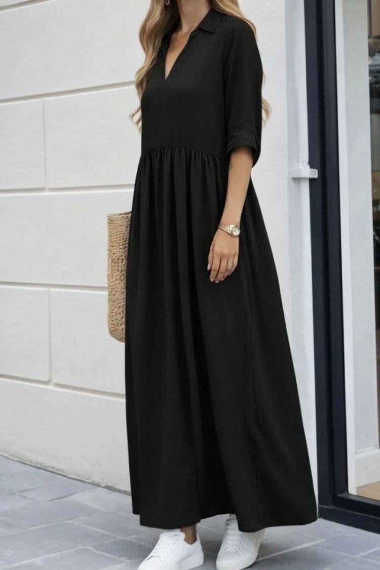 Aerobin kumaşın kendine has dokusunu ve konforunu zarafetle buluşturan bu elbise, her mevsim çabasız şıklığın anahtarıdır. Truvakar kol boyu ile hem klasik hem de modern bir hava yakalayan tasarım, derin V yaka detayıyla boyun hattınızı zarifçe vurgular. Etek kısmındaki yırtmaç detayı hareketlerinize dinamizm ve özgürlük katarken, uzun kesimi sayesinde asil bir silüet oluşturur. Ütü gerektirmeyen yapısı ve nefes alan dokusuyla gün boyu süren bir ferahlık vadeder.