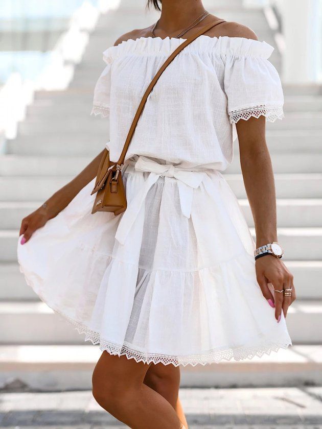 Kadın Dantel Detaylı Madonna Yaka Beli Kuşaklı Keten Kumaş Elbise