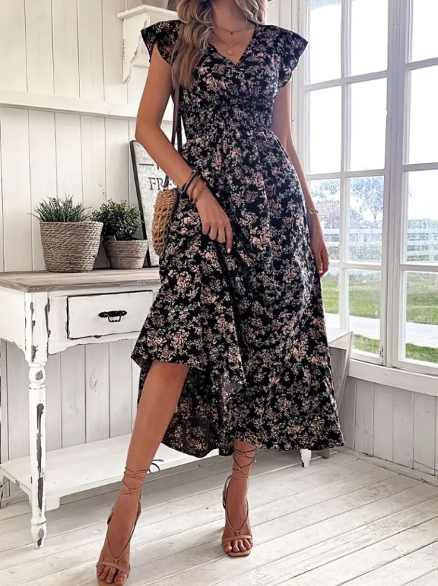 Kadın Kısa Kollu Kruvaze Yaka Beli Lastikli çiçek Desenli Elbise