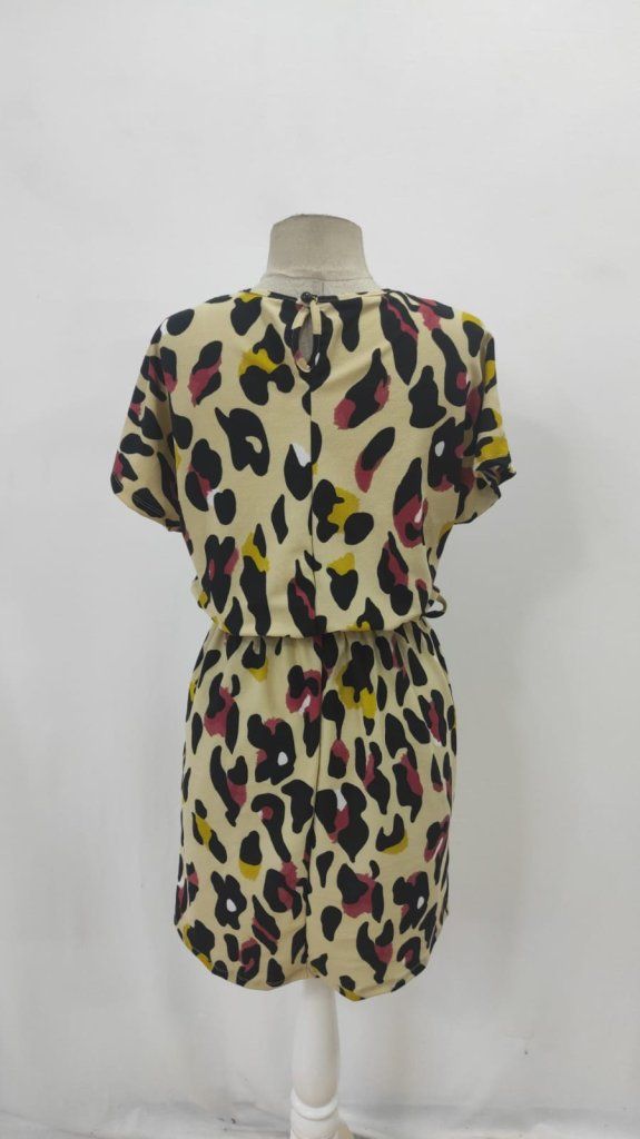 Kadın Kısa Kollu Yuvarlak Yaka Beli Kuşaklı Geometrik Desenli Süprem Elbise