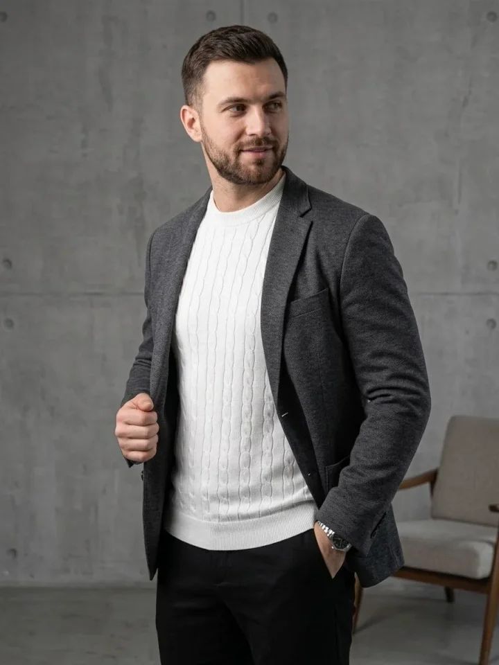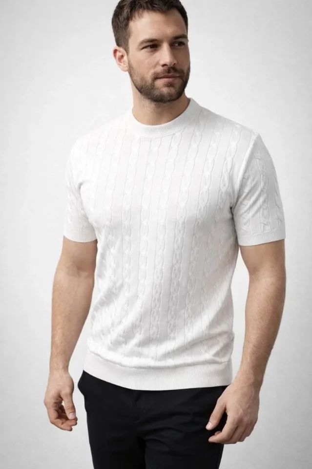 Erkek Yazlık Triko Dokuma Tişört Kısa Kol Bisiklet Yaka Örgü Desenli T-Shirt - Beyaz