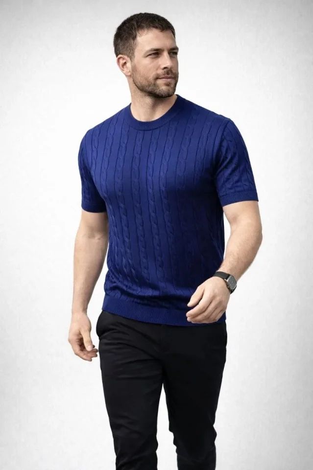 Erkek Yazlık Triko Dokuma Tişört Kısa Kol Bisiklet Yaka Örgü Desenli T-Shirt - Lacivert