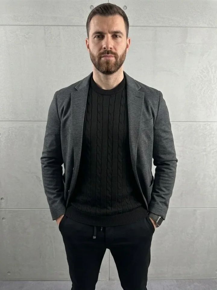 Erkek Yazlık Triko Dokuma Tişört Kısa Kol Bisiklet Yaka Örgü Desenli T-Shirt - Siyah
