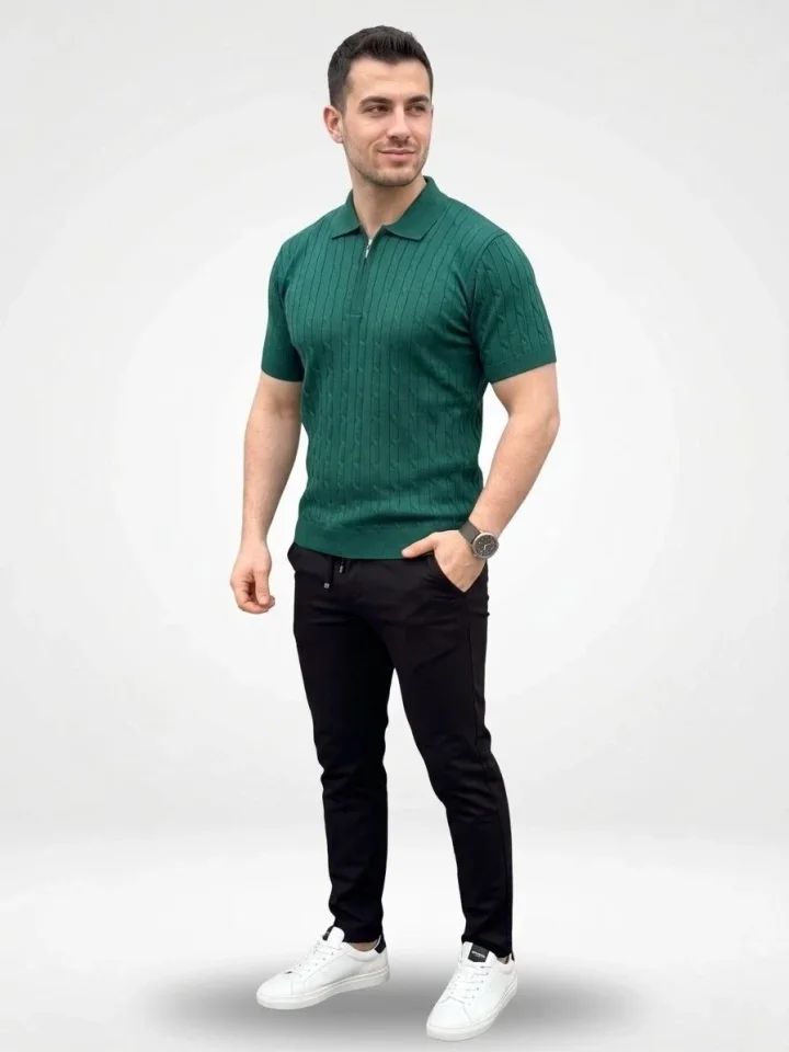 Erkek Yazlık Triko Saç Örgü Tişört Kısa Kol Polo Yaka Fermuarlı T-Shirt - Haki