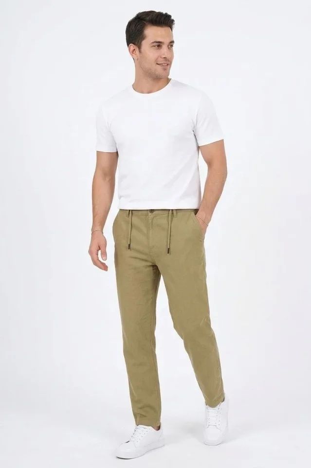 Erkek Keten Cepli Pantolon Lastikli Bel Bağcıklı Önden Fermuarlı - Mint Yeşili