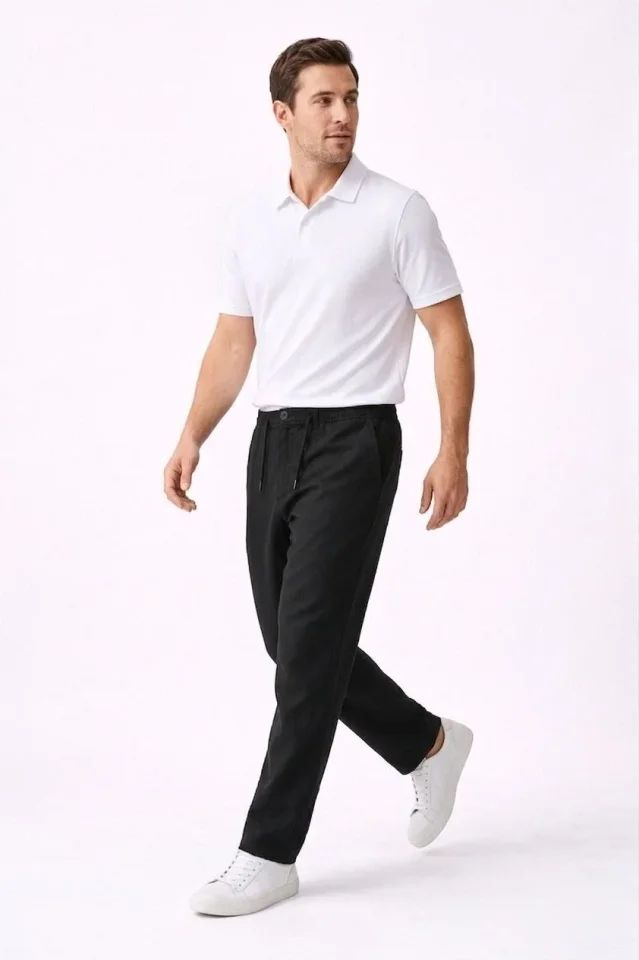 Erkek Keten Cepli Pantolon Lastikli Bel Bağcıklı Önden Fermuarlı - Siyah