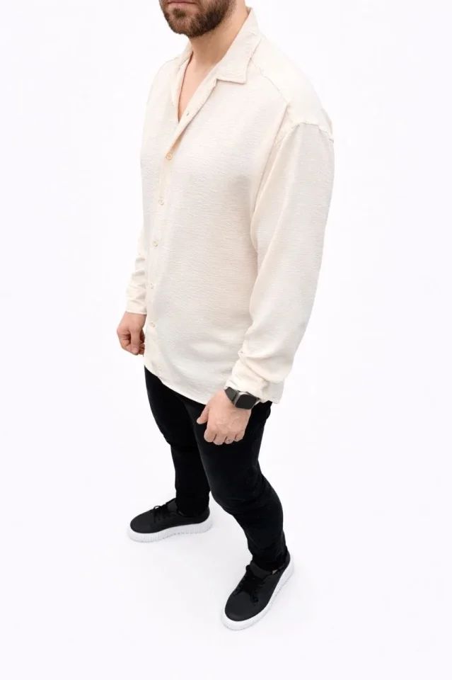 Erkek Aerobin Kumaş Oversize 4 Mevsim Uzun Kollu Rahat Kalıp Gömlek - Bej