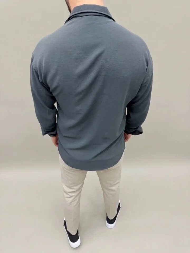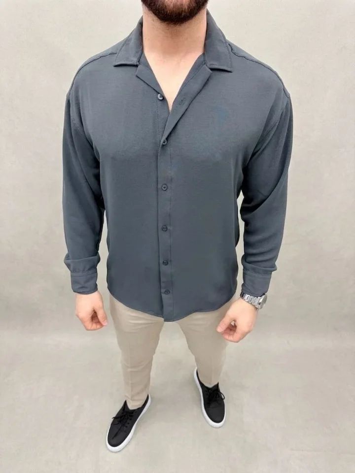 Erkek Aerobin Kumaş Oversize 4 Mevsim Uzun Kollu Rahat Kalıp Gömlek - Füme
