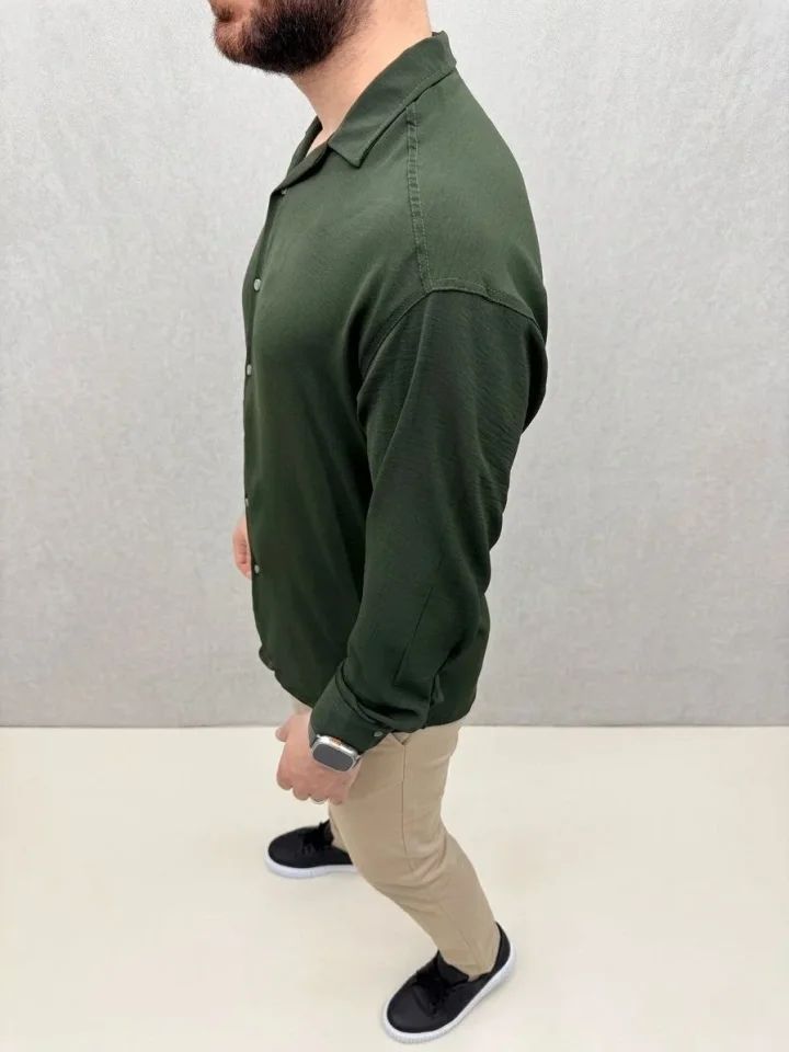 Erkek Aerobin Kumaş Oversize 4 Mevsim Uzun Kollu Rahat Kalıp Gömlek - Haki