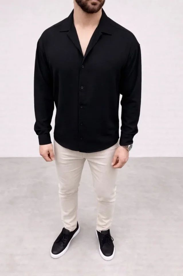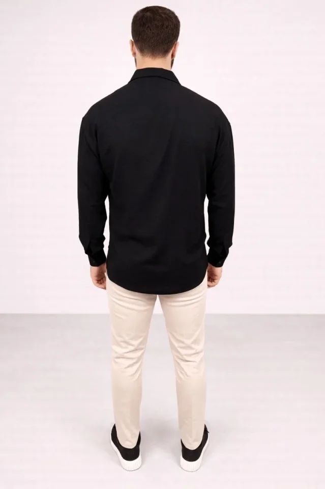 Erkek Aerobin Kumaş Oversize 4 Mevsim Uzun Kollu Rahat Kalıp Gömlek - Siyah