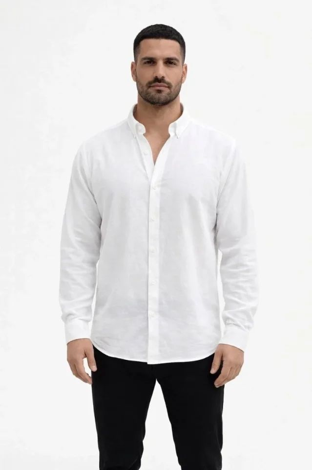 Erkek KETEN Kumaş Oversize Uzun Kollu Rahat Kalıp Gömlek - Beyaz