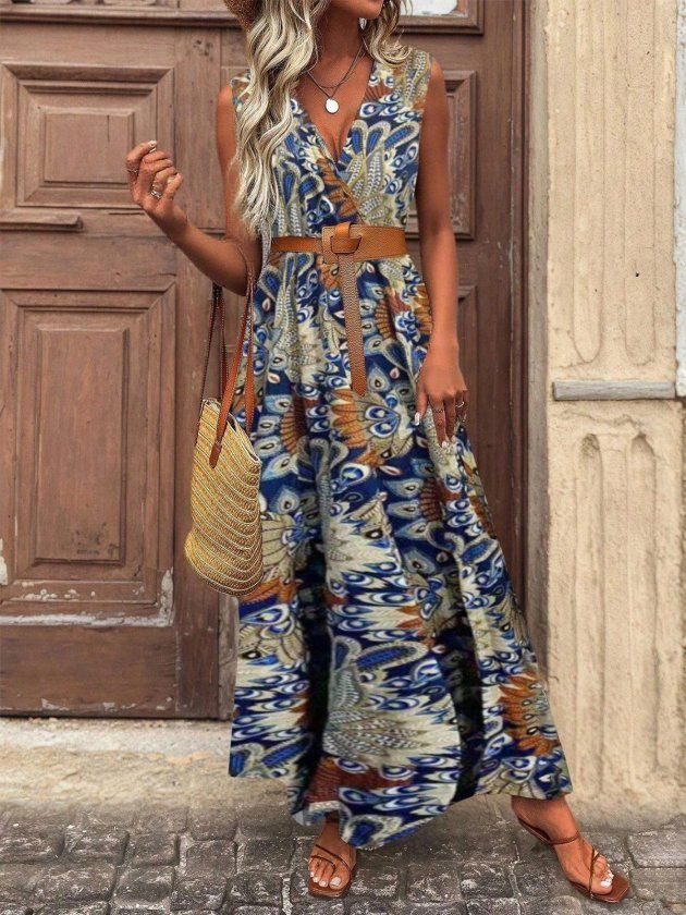Kadın Askılı Kruvaze Yakalı Uzun Desenli Kemersiz Süprem Elbise
