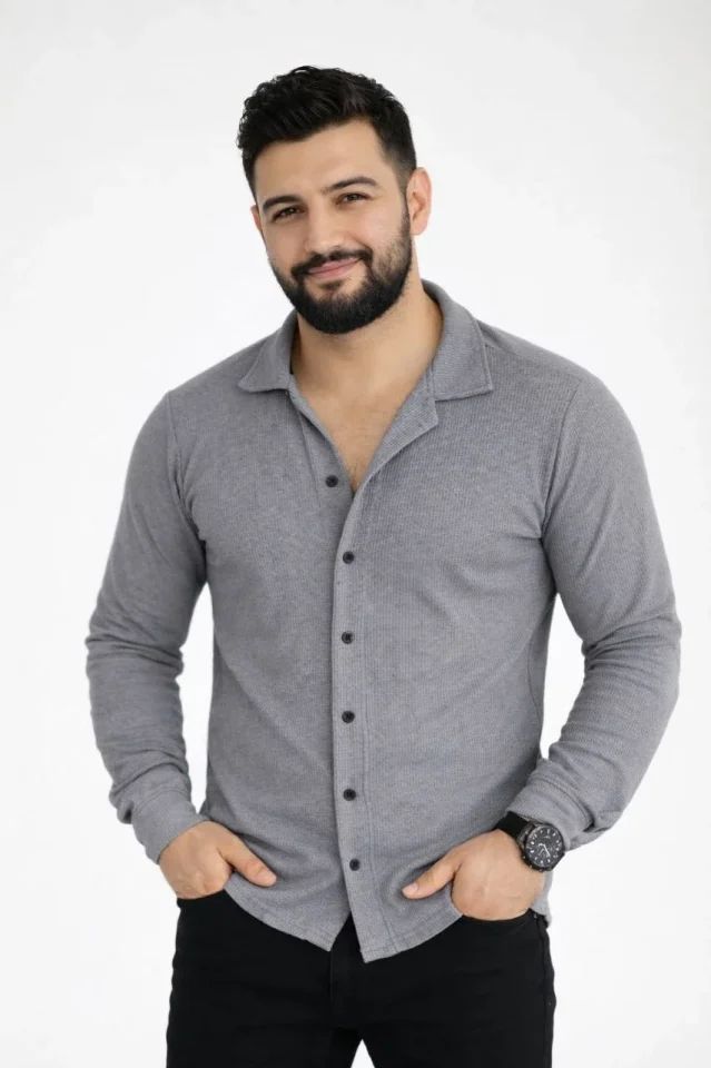 Erkek Waffle Kumaş Uzun Kollu Düğmeli Açık Yaka Regular Fit Gömlek - Füme