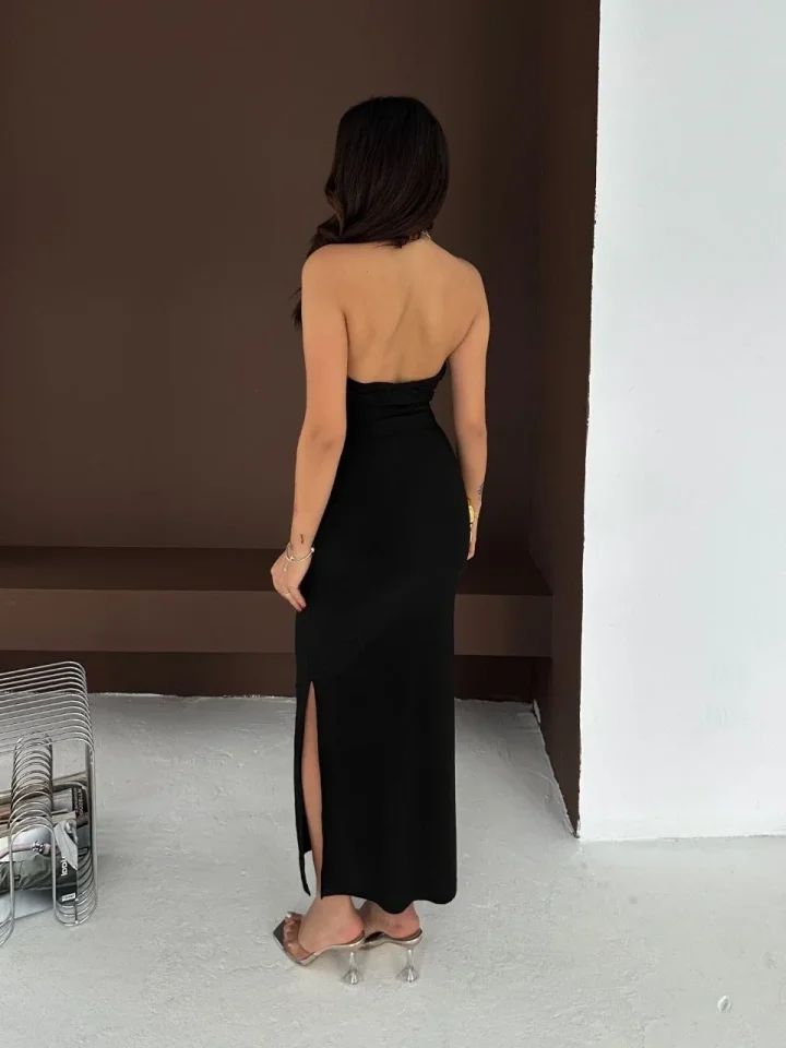 Uzun Abiye Elbise Yırtmaçlı Sırt Dekolteli Şık Gece Elbisesi - Siyah