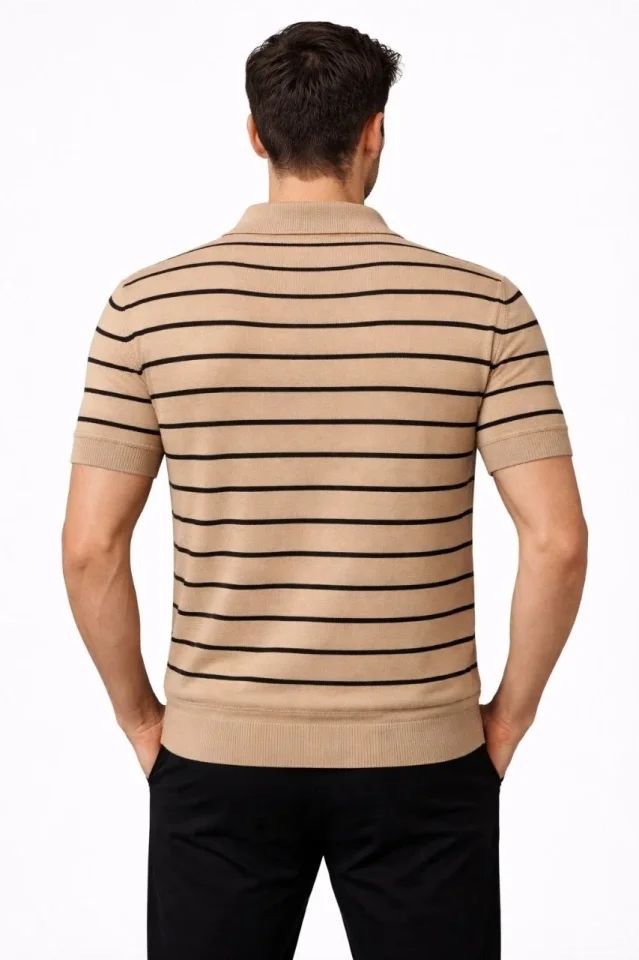 Erkek Triko Polo Yaka Fermuarlı Çizgili Tişört T-Shirt Yazlık Şık - Kahverengi