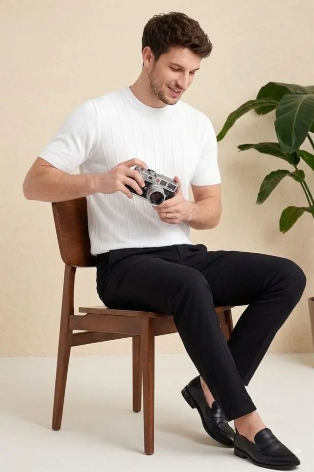 Erkek Yazlık Fitilli Triko Tişört Kısa Kol Bisiklet Yaka T-Shirt - Beyaz