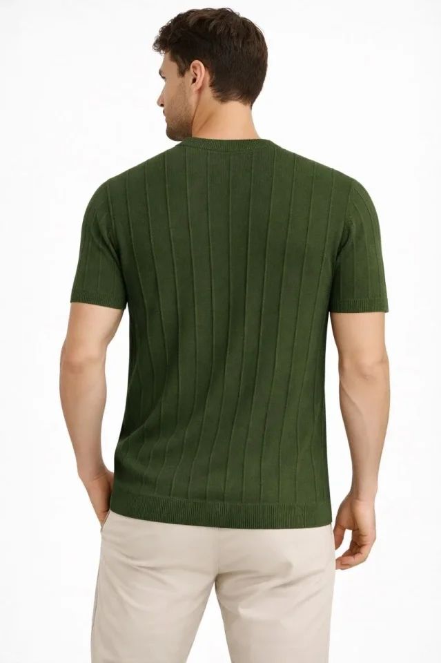Erkek Yazlık Fitilli Triko Tişört Kısa Kol Bisiklet Yaka T-Shirt - Haki
