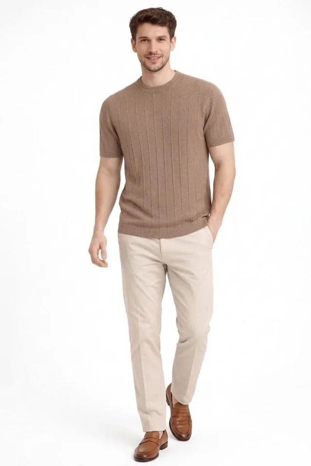 Erkek Yazlık Fitilli Triko Tişört Kısa Kol Bisiklet Yaka T-Shirt - Kahverengi