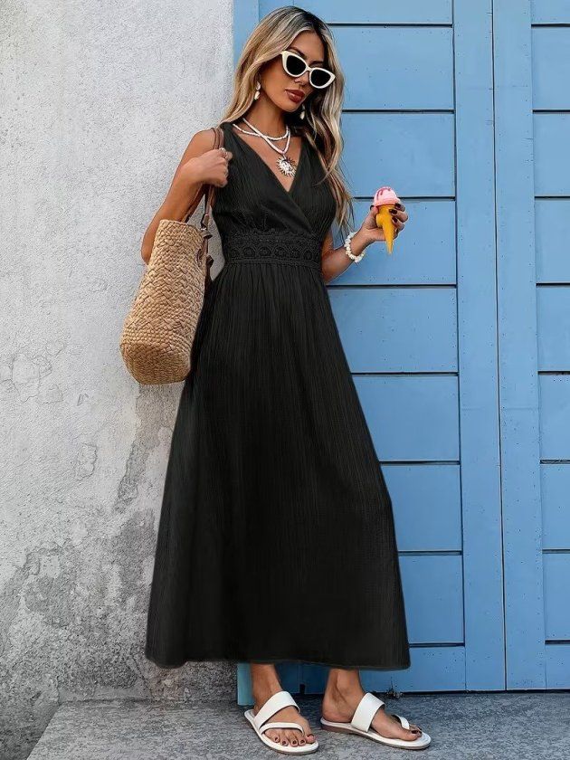 Kadın Askılı Kruvaze Yakalı Belden Dantelli Uzun Bürümcük Elbise