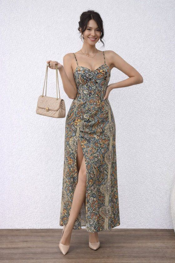 Kadın Ip Askılı Arkadan çapraz Kesim Detaylı Uzun Desenli Süprem Elbise