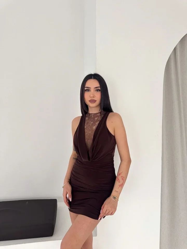 Dantel Detaylı Derin Dekolte Drapeli Mini Elbise Şık Kolsuz - Kahvrenegi