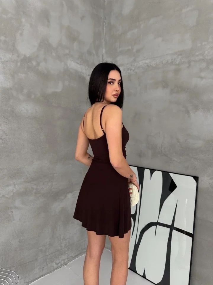 Askılı Şifon Mini Elbise Drapeli Bel Vücuda Oturan Yazlık Şık - Kahverengi