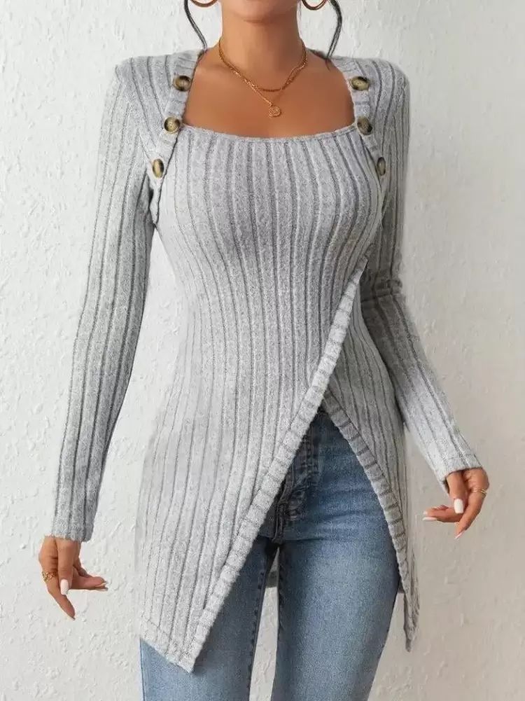 Derin Kare Yaka Kesimi: Omuz ve boyun hattını daha belirgin ve zarif gösteren, modern moda trendlerine uygun yaka tasarımı.