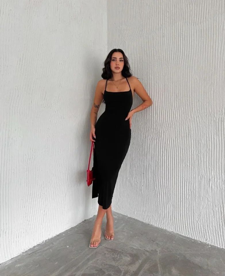 İp Askılı Sırt Dekolteli Bağlama Detaylı Yırtmaçlı Midi Elbise - Siyah