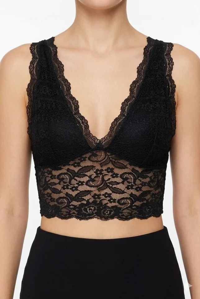 Dantel Bralet Crop Sütyen V Yaka Askılı Şık Esnek Rahat - Siyah
