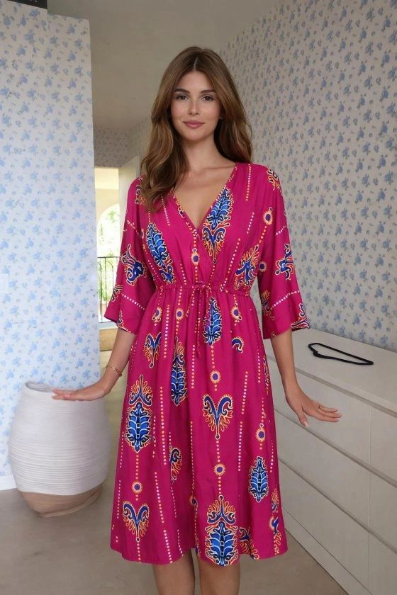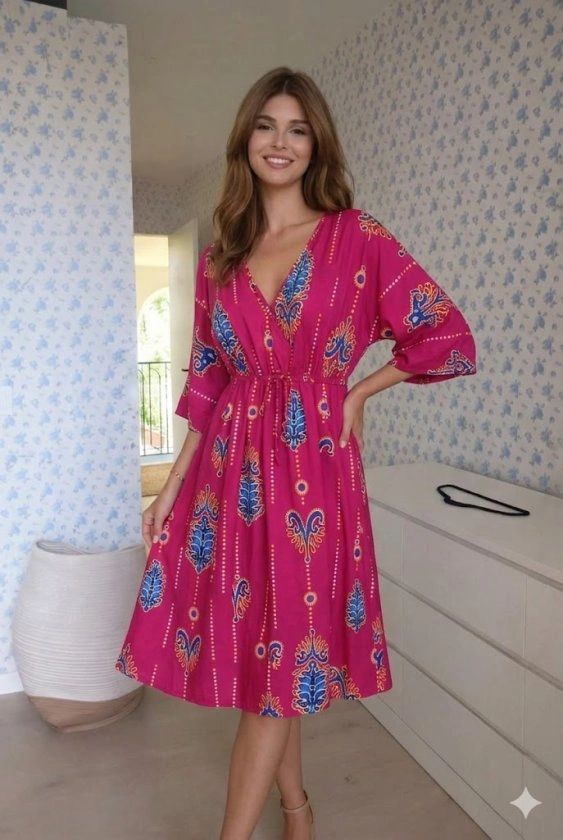Etnik desenlerin zamansız ruhunu modern bir kesimle buluşturan bu midi boy elbise, gardırobunuza bohem bir zarafet katıyor. V yaka tasarımıyla boyun hattınızı zarifçe vurgularken, belindeki ayarlanabilir bağçık detayı sayesinde silüetinizi dilediğiniz gibi formlandırabilirsiniz. Akışkan kumaşı ve hareketli desenleri ile hem günlük şehir gezintilerinde hem de sahil şıklığında size eşlik edecek bu parça, konfor ve estetiği bir arada sunar.