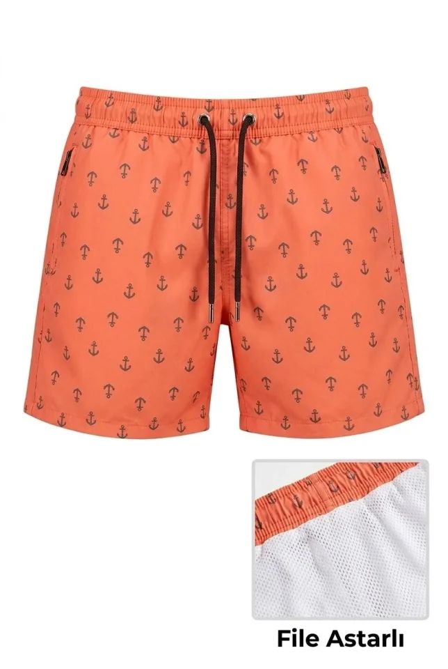 Erkek Deniz Şortu Fermuarlı Cepli File Astarlı Hızlı Kuruyan Premium - Turuncu