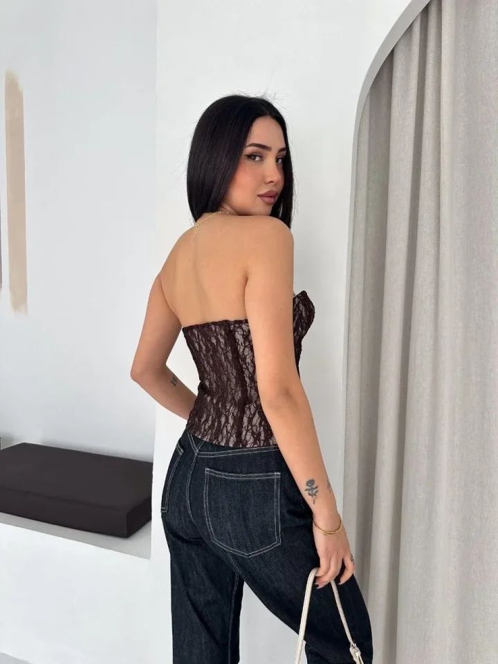 Fermuarlı Dantel Korse Straplez Bustiyer Transparan Şık Top - Kahverengi