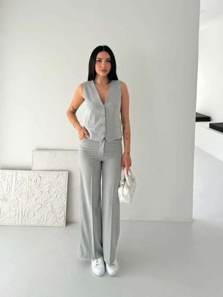 Çizgili Tansel Kumaş Yelek Pantolon İkili Takım Ofis Şık Modern - Gri