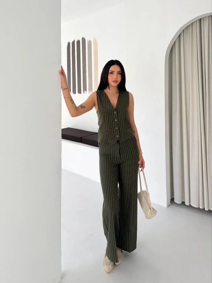Çizgili Tansel Kumaş Yelek Pantolon İkili Takım Ofis Şık Modern - Haki