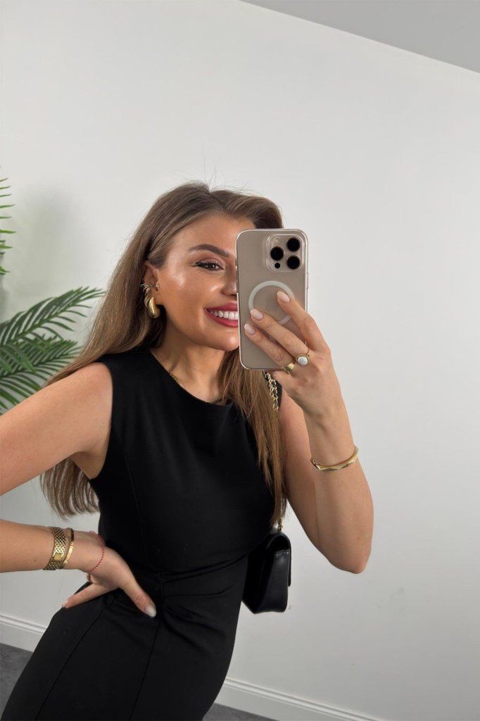 Kadın Askılı Kolsuz Belden Büzgülü Yırtmaçlı Midi Janjan Krep Elbise
