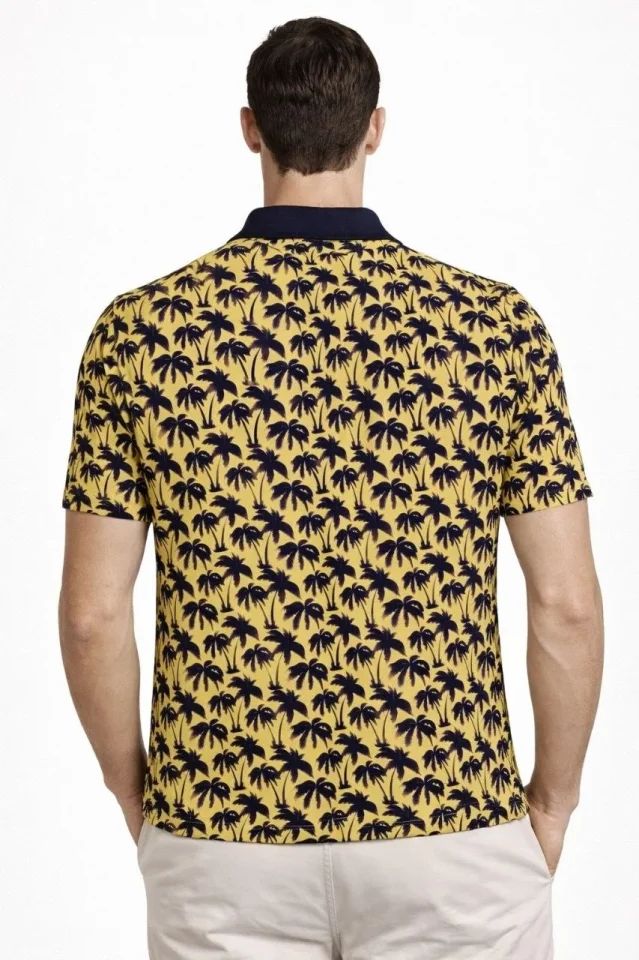 Erkek Pike Kumaş Polo Yaka Palmiye Desenli Tişört Kısa Kol Yazlık T-Shirt - Sarı