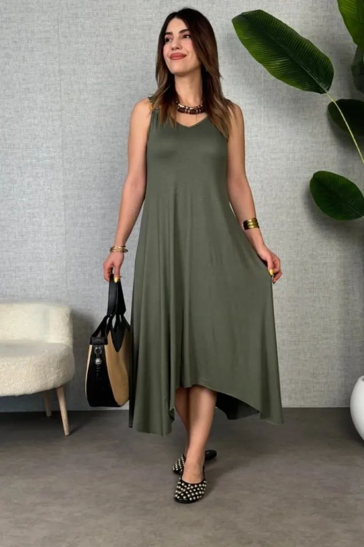 Çabasız şıklığın en konforlu hali! ✨ Kadın Çan Dokuma Asimetrik Kesim Elbise ile stilinize hareket katın.