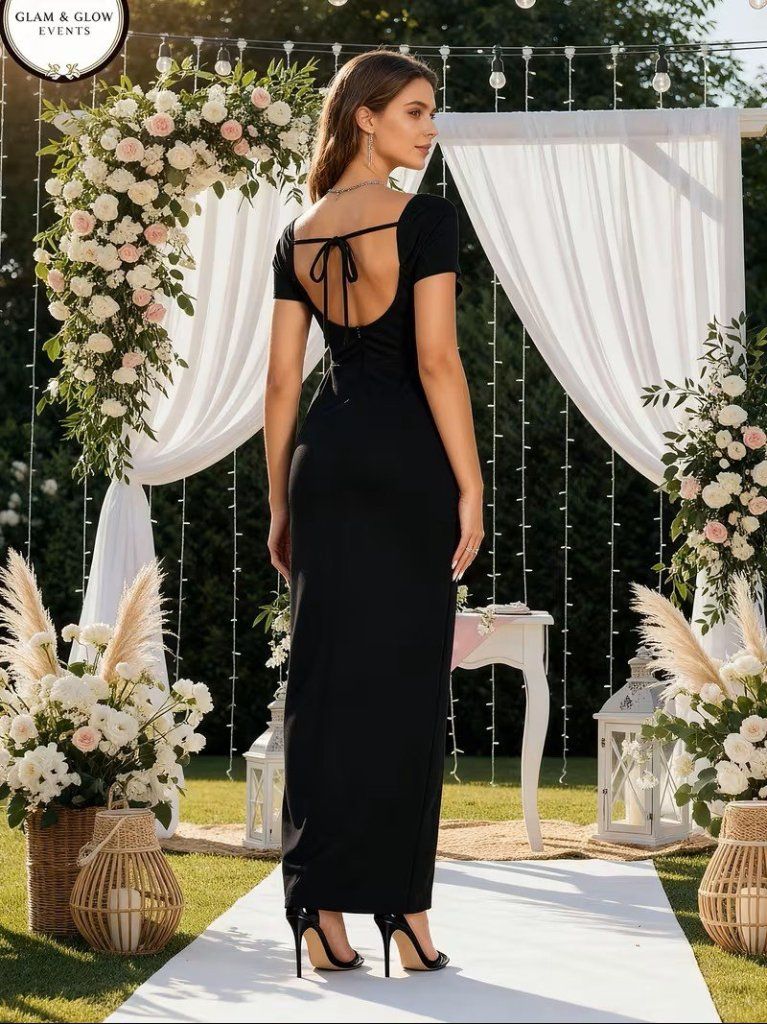 Kadın Kısa Kollu Kare Yakalı Sim Detaylı Arkadan Bağcıklı Yırtmaçlı Uzun Ithal Krep Elbise