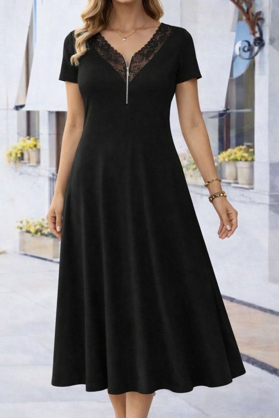 Kadın Kısa Kollu Dantel V Fermuar Yakalıuzun Viskon Elbise