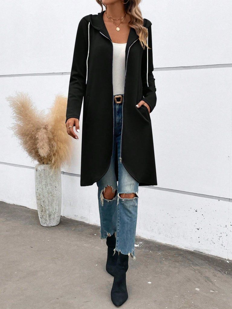 Kadın Uzun Kollu Kapşonlu önden Fermuarlı Midi Dalgıç Ceket