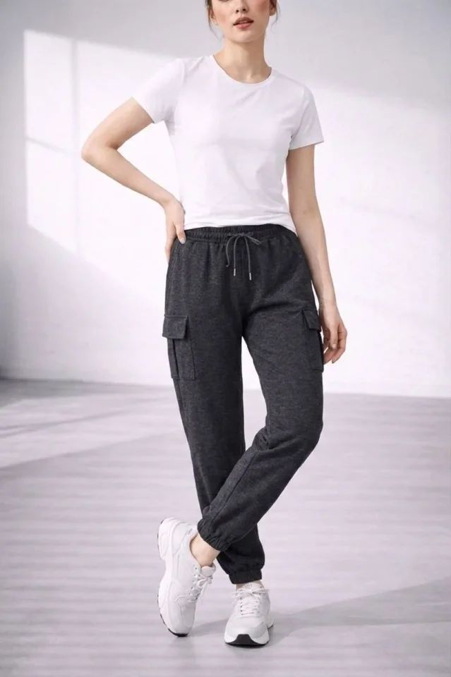 Jogger Eşofman Altı Rahat Kalıp, Kargo Cepli, Lastikli Paça, Günlük Spor Pantolon - Füme