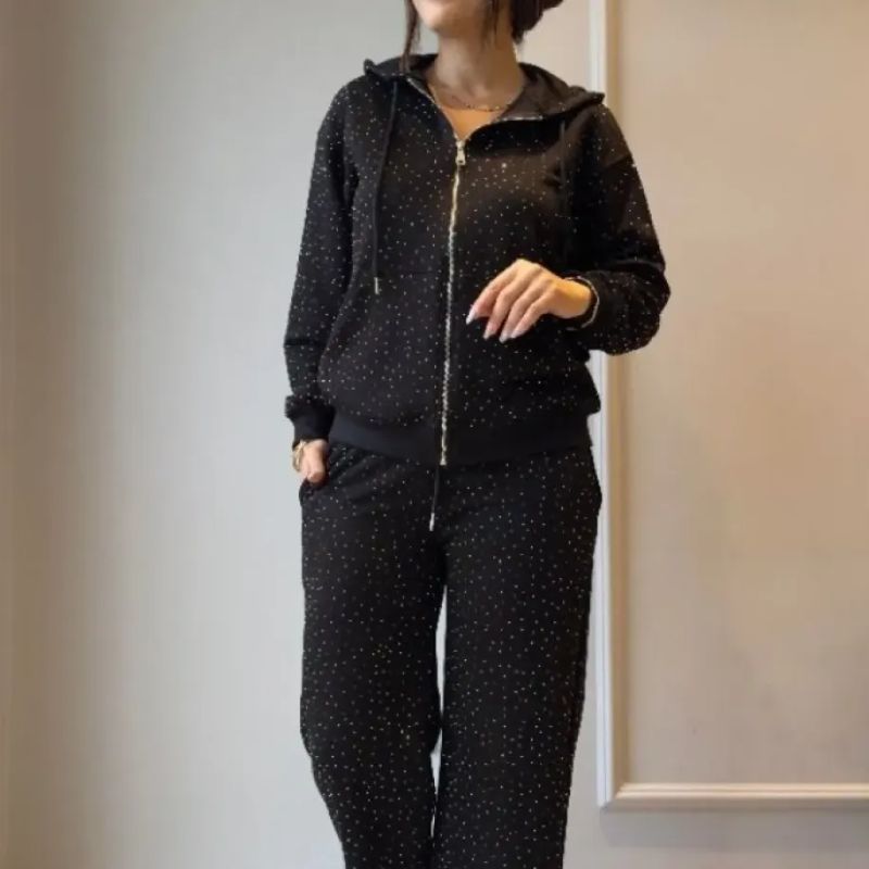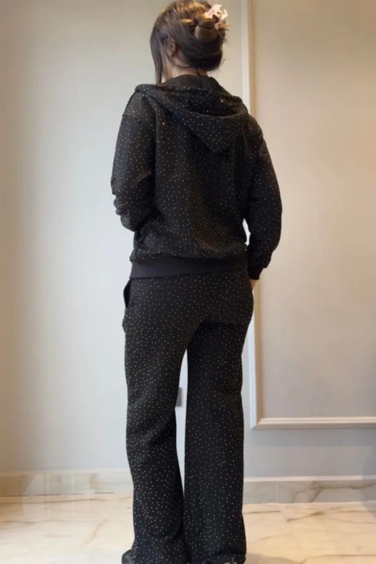 Bu takım, "sportif şıklık" (athleisure) akımının en güzel temsilcilerinden biridir. Hafta sonu gezilerinde, alışverişte veya seyahatlerde zahmetsizce şık görünmenizi sağlar. Siyahın asaletini taşların ışıltısıyla buluşturan bu set, tek bir dokunuşla hazır olmanızı sağlayarak gardırobunuzun en çok tercih edilen parçası olacak.
