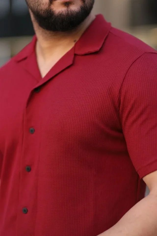 Erkek Waffle Kumaş Kısa Kollu Düğmeli Açık Yaka Regular Fit Gömlek - Kırmızı