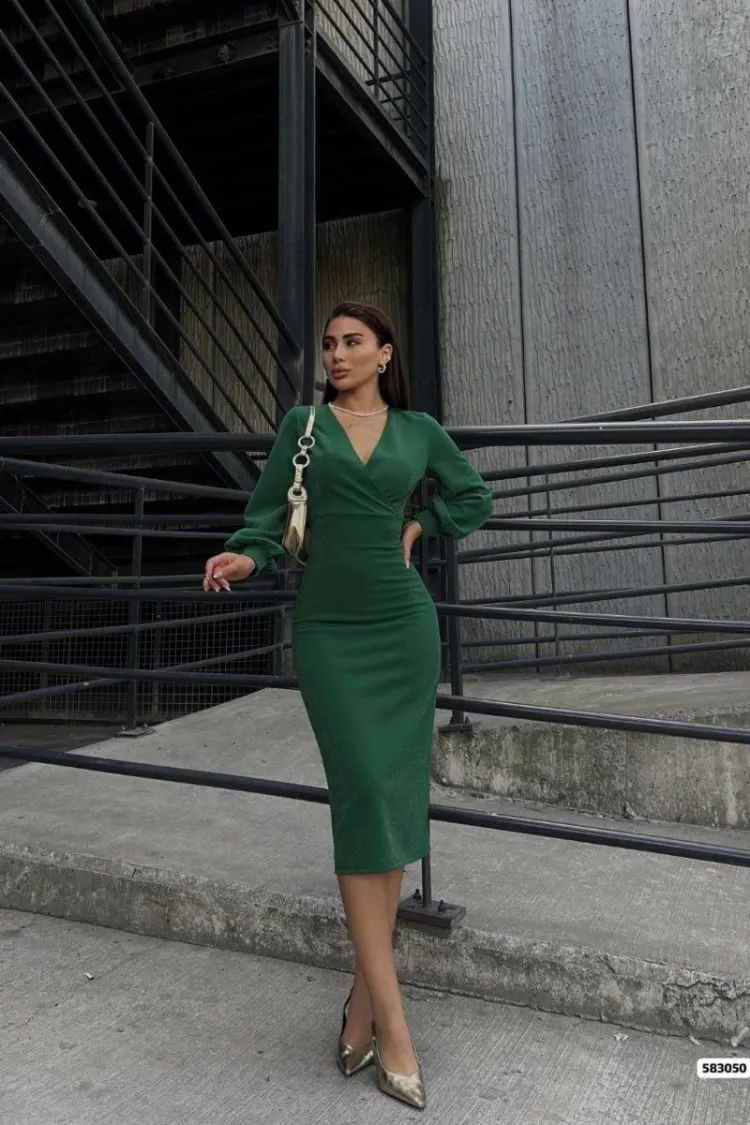 Özel davetlerin, akşam yemeklerinin ve şıklığın ön planda olduğu her anın yıldızı olmaya hazır mısınız? Göz alıcı zümrüt yeşili tonu ve simli dokusuyla bu elbise, klasik zarafeti modern detaylarla birleştiriyor. Vücut hatlarını kusursuzca çevreleyen kesimi ve sofistike balon kollarıyla stilinizi en üst seviyeye taşıyın.