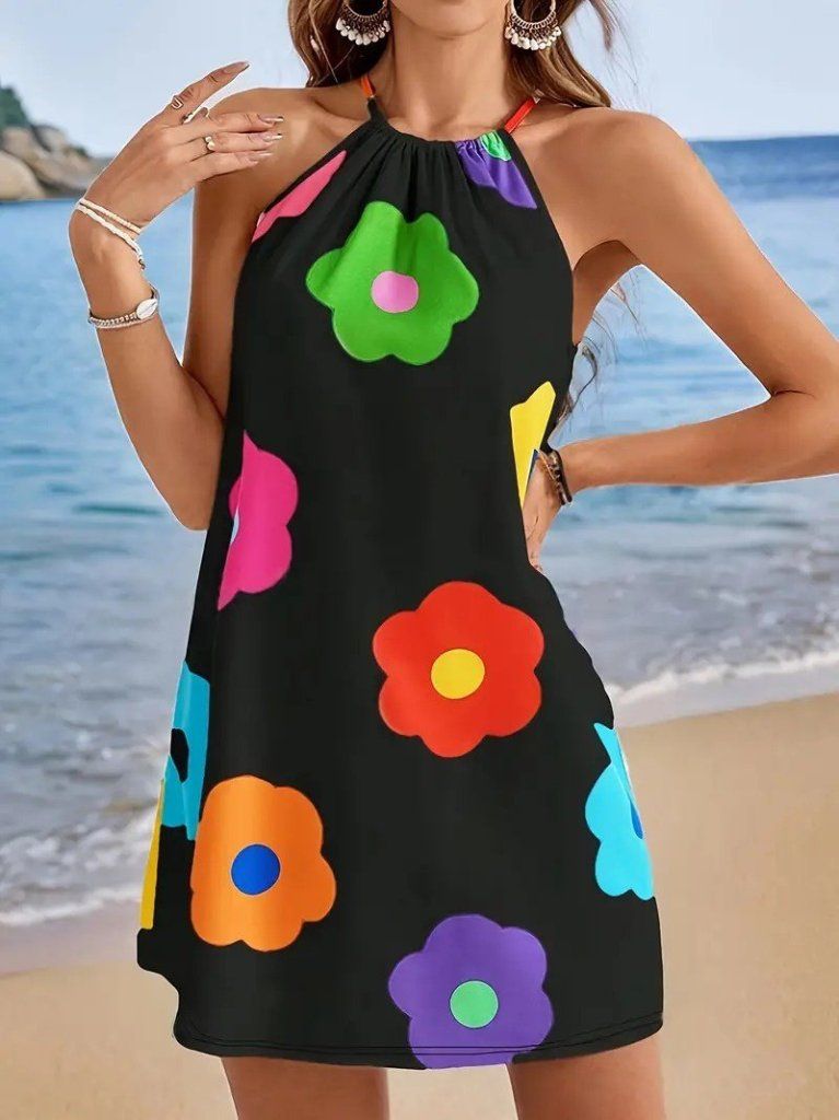 Kadın Boyundan Askılı Kolsuz çiçek Desenli Süprem Elbise